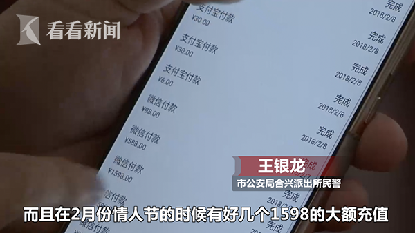 市公安局合兴派出所民警王银龙:“从3月份,2月份,有非常非常多的(消费)记录,而且在2月份情人节的时候有好几个1598的大额充值,这些记录持续(消费)往前要到1月份。”