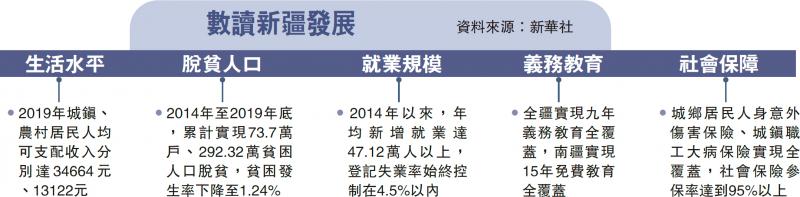 声明提到,新疆各族群众生活水平逐年提高,2019年城镇、农村居民人均可支配收入分别达到34664元(人民币,下同)、13122元。2014年至2019年底,全区累计实现73.7万户、292.32万贫困人口脱贫,贫困发生率由2013年底的19.4%下降至1.24%。2020年底,现行标准下的新疆农村贫困人口将全部脱贫,同全国人民一道同步迈入全面小康社会。